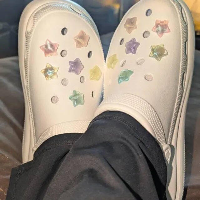 Add a dreamy touch to your favourite clogs or sandals with these adorable mini shoe charms! Featuring pastel hearts and stars with a shimmering aurora finish, they sparkle beautifully in sunlight, creating a soft iridescent glow.